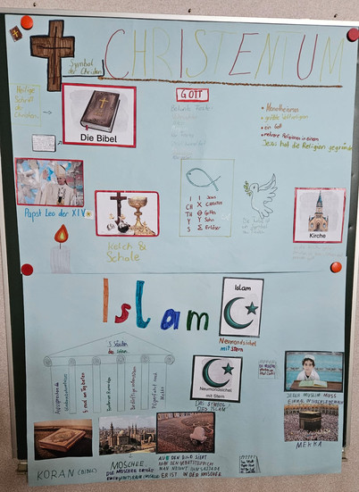 Im Religionsunterricht der vierten Klassen haben wir uns in den letzten Wochen intensiv mit den drei großen monotheistischen Weltreligionen – Judentum, Christentum und Islam – beschäftigt. Die Schülerinnen und Schüler haben in Gruppen selbstständig Plakate zu den einzelnen Religionen gestaltet und ihr erarbeitetes Wissen anschließend der Klasse präsentiert. Besonders erfreulich war das große Engagement vieler Kinder: Ein Schüler hat sich für sein Referat sogar so viele Gedanken gemacht, dass er passend zum Thema Fladenbrot gebacken und jüdische Symbole zur Veranschaulichung mitgebracht hat. Diese kreative und motivierte Mitarbeit hat unsere gemeinsame Lernzeit besonders bereichert.